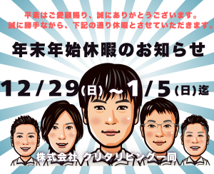 当社の年末年始休暇につきまして下記の通り休業とさせていただきますので、ご案内申し上げます。