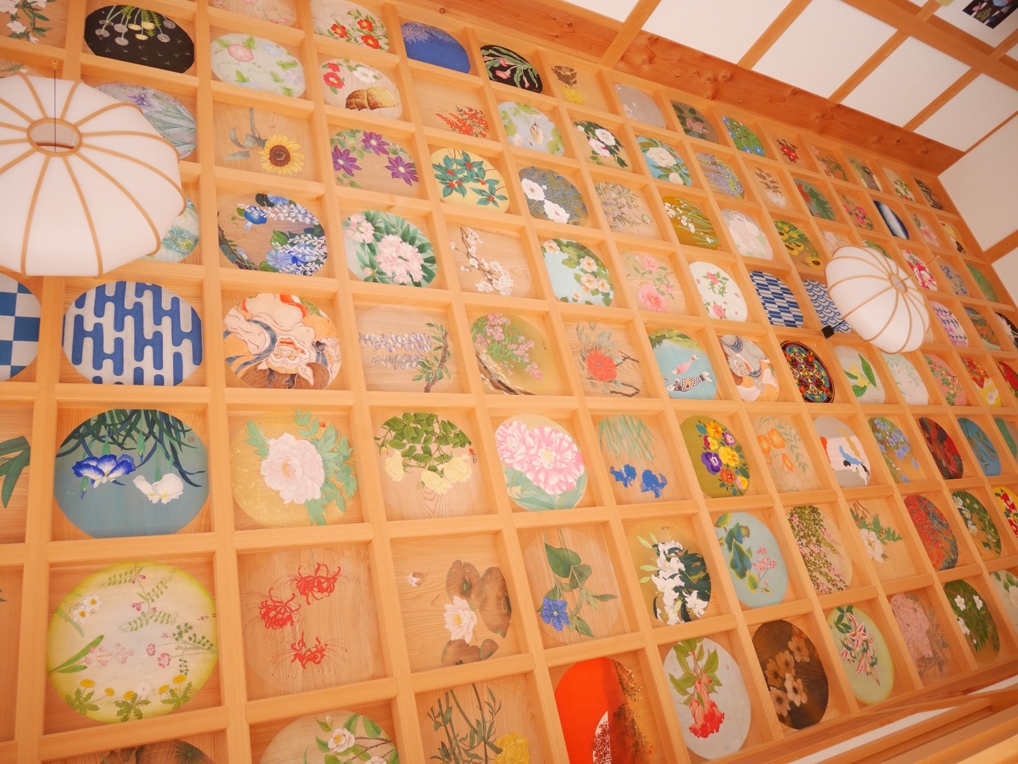 花をテーマに描かれた160枚の画が客殿の天井をカラフルに埋め尽くしています。