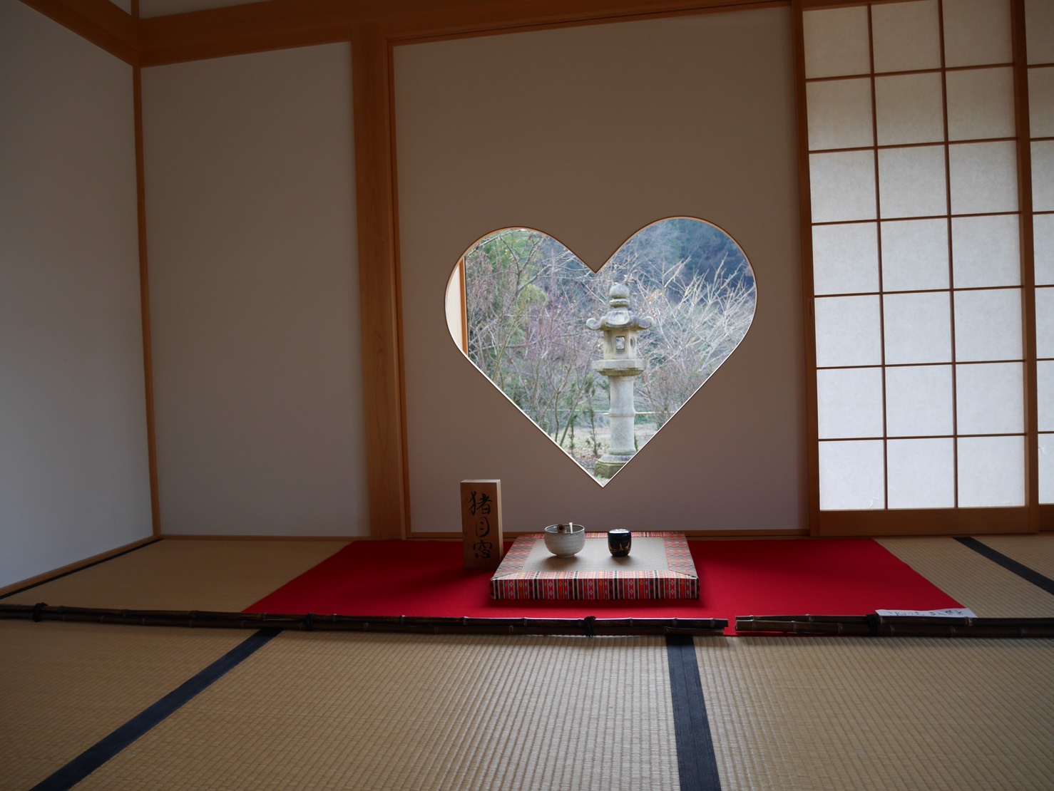 この”ハートの窓”は「正寿院」の客殿にあり、正式には「猪目窓(いのめまど)」と呼ばれるお茶室の窓の形状の1つです。