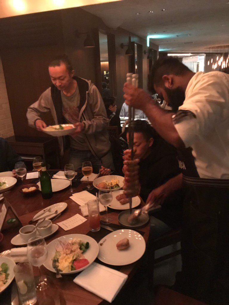 少し経つと、ホールスタッフの方が串に刺さった状態の肉を持ってきてくれて食べる人数を確認すると、ものすごい手際の良さで肉塊にナイフを入れて取り分けてくれます。