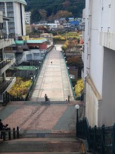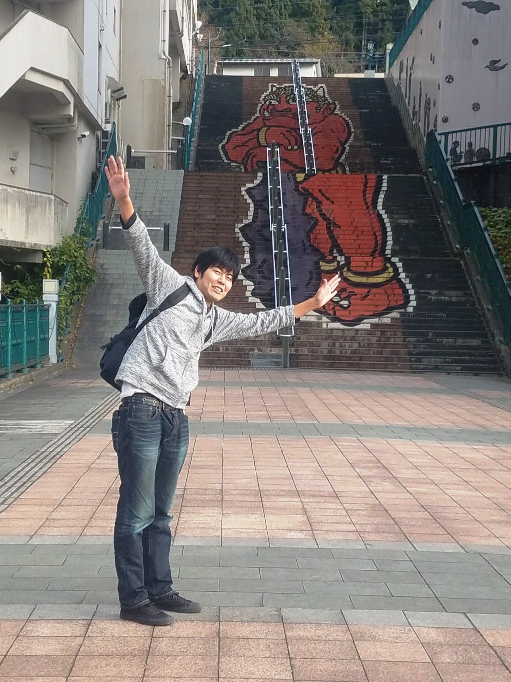 そんな階段に描かれたすごい鬼を見ながら僕たちは
