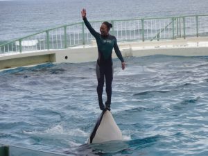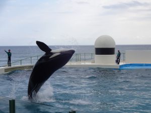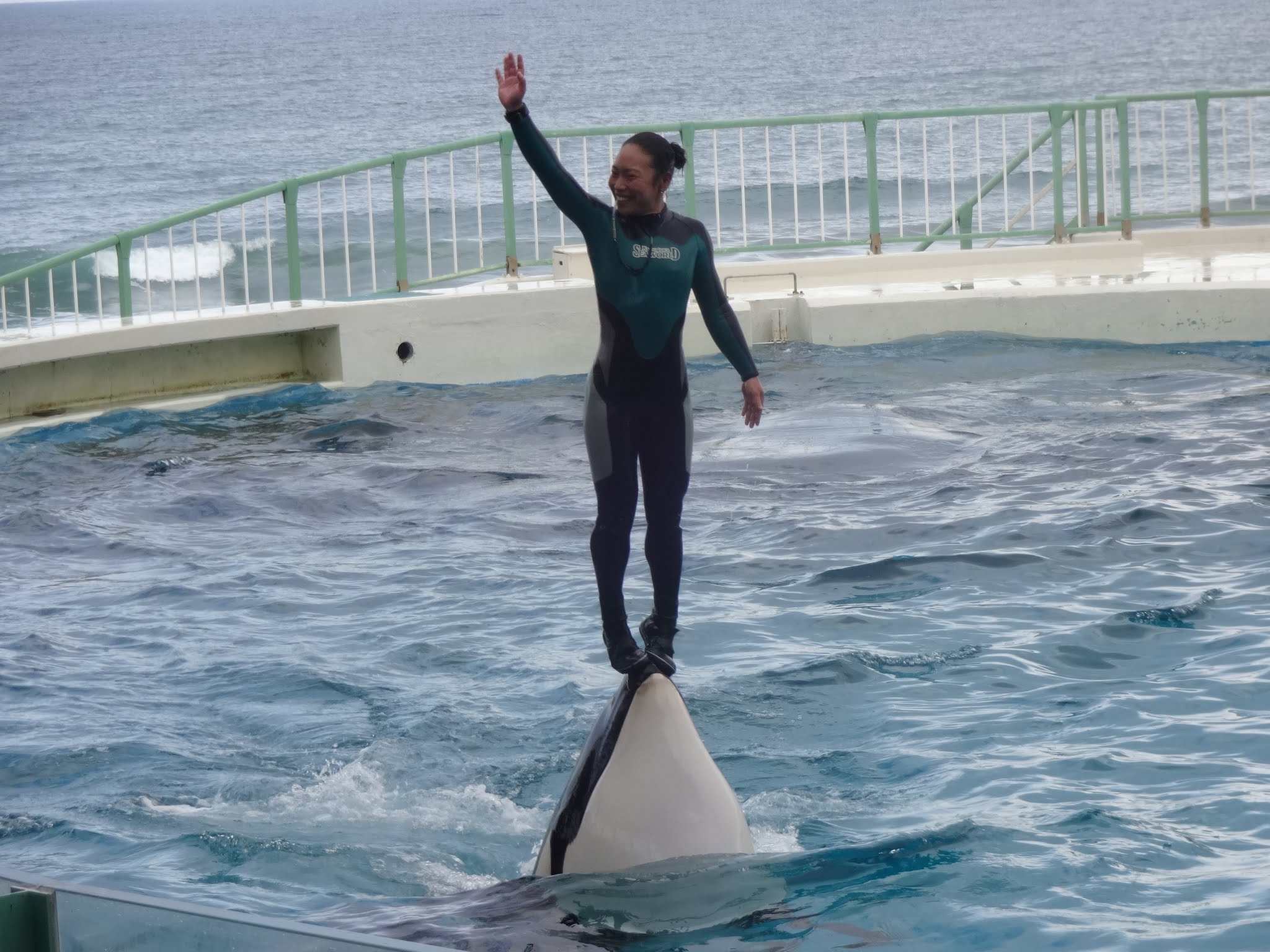 看板のシャチのショーは圧巻で、何度も巨体が飛んではしぶきを上げて入水すると、