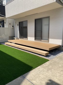 ウッドデッキはお庭側全面で、1段のステップ