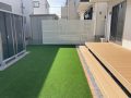 ウッドデッキ下は砂利敷きで、人工芝との境目