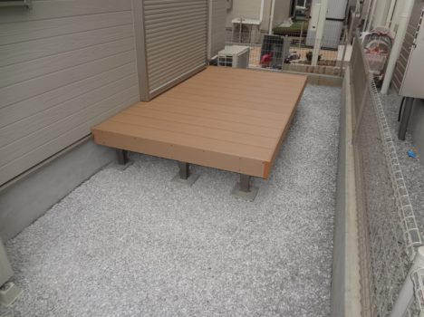 砂利を敷いて、リビングの掃き出し窓前にウッド